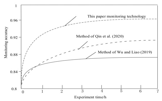 Comparing Figure 4, it can be seen that under the same parameter conditions, the monitoring accuracy of the method of Wu and Liao is 86% on average, and the monitoring accuracy of the method of Qin et al. is 90% on average [6,7]. However, the marine environment under the cloud computing platform in this paper is corrosive. The monitoring accuracy of pollution monitoring technology is relatively high, at about 96% on average. The main reason for this difference is that this article collects data on corrosive pollution in the marine environment, strengthens the control of the data, and at the same time facilitates the development of monitoring experiments under the same conditions, and so, can better obtain effective data. The interference of factors reduces the influence of unfavorable factors, and finally obtains a more complete monitoring image, which is convenient for the research of monitoring objects, enhances experimental concentration, reduces monitoring errors, further improves the monitoring performance of the monitoring system, and finally obtains a higher monitoring accuracy rate. However, traditional methods deal with this aspect poorly, the initial data processing is imperfect, and the monitoring accuracy rate is low.