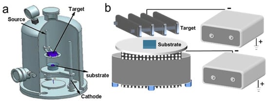 (a) The schematic diagram of the DGPSA device. (b) Tooling structure of cathode and source in double glow plasma sputtering process.