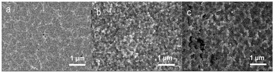 Figure 3 shows the SEM micrographs of the Nb-Zr alloying layers prepared at (a) 30 Pa, (b) 40 Pa, and (c) 50 Pa pressures. From the figures, it can be seen that the microstructure of the studied Nb-Zr alloying layers varied with the pressure. The Nb-Zr alloying layer prepared by 40 Pa of air pressure had a good surface morphology, uniform and dense alloying layer with an island-like structure, and no cracks or pores on the surface. When the air pressure was 30 Pa, the supply of alloying elements was insufficient, so the surface of the substrate could not be completely filled with alloying elements, and the growth of the surface alloying layer was inhibited. Thus, the surface morphology of the alloying layer was incomplete. When the gas pressure was 50 Pa, the reverse sputtering effect on the surface of the substrate was enhanced, and the bombardment of high-energy particles aroused the active atoms that had been adsorbed on the surface of the substrate, which affected the surface integrity of the alloying layer.