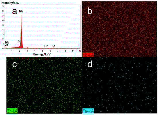 Figure 4 shows the element distribution diagram on the surface of the Nb-Zr alloying layer sample prepared at 40 Pa of pressure. The image shows that the surface elements of the sample were mainly Nb, Zr, Fe, and Cr, and there were no peaks for the other elements in the energy spectrum, which indicates that the alloying layer did not appear to be oxidized during the preparation process. According to Table 2, the contents of Nb and Zr were 85.18% and 8.11%, respectively, and the contents of Fe and Cr were 5.10% and 1.61%, respectively.