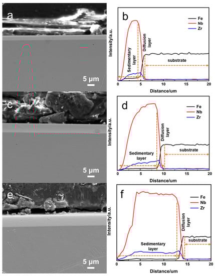 The cross-sectional morphologies and element content of the Nb-Zr alloying layers varied with the depth of the alloying layer, as shown in Figure 5. The results show that the cross-sectional morphology of the alloying layers of all samples was complete, being without micropores and cracks, and the thickness of the alloying layer changed with the deposition pressure. The cross-sectional thicknesses of the alloying layer prepared by 30 Pa, 40 Pa, and 50 Pa of pressure were about 6 μm, 10 μm, and 14 μm, respectively, and the alloying layer was divided into a deposition layer and a diffusion layer. The deposition layer was mainly composed of the alloying elements Nb and Zr. The content of the Nb and Zr elements was far more than that of the matrix element. The alloying elements Nb and Zr and the matrix element Fe coexisted in the diffusion layer. In the diffusion layer, Nb and Zr atoms diffused into the substrate, Fe atoms diffused outward, and the content of the diffused alloying elements decreased with the depth. The thickness of the Nb-Zr alloying layer prepared at 30 Pa of pressure was only about 6 μm. When the deposition pressure was too low, the supply of the target elements was insufficient, resulting in a low thickness of the alloying layer on the surface of the substrate. The thickness of the alloying layer at a pressure of 40 Pa was approximately 10 μm, while the thickness of the alloy layer at a pressure of 50 Pa was 15 μm.