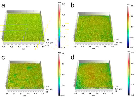 Figure 6 shows the surface roughness of the samples prepared at different air pressures. After the alloying layers were prepared on the surface, the surface roughness increased significantly, and the air pressure directly affected the value of the surface roughness. The Nb-Zr alloying layer surface height parameter Sq (root mean square height) was calculated as follows: