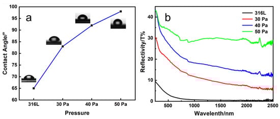 Figure 7a shows the water contact angles of the corresponding samples. It can be observed that the water contact angle of the substrate surface was about 65°. After the alloying layer was deposited, the water contact angle significantly increased. The water contact angle on the surface of the 30 Pa alloying layer sample was about 83°, and with the increase in air pressure, the water contact angle rose to 92° and 98° for 40 Pa and 50 Pa, respectively. The increased water contact angle confirms that the Nb-Zr alloying layer obtained during the plasma deposition process enhanced the hydrophobicity of the substrate surface. The superhydrophobic surface showed better potential in terms of blood compatibility, and the ability of the surface to adsorb cells was affected by the surface roughness and the amount of crystal grains. The reflectivity test was performed on the substrate and the Nb-Zr alloying layers prepared at different pressures as shown in Figure 7b. In the 780–2500-nm wavelength range, the average reflectivity of the substrate was only 2%, the average reflectivities of the alloying layer samples prepared under 30 Pa and 40 Pa of pressure were close to 10% and 20%, respectively, and the samples prepared under 50 Pa of pressure showed an average reflectivity of about 30%.