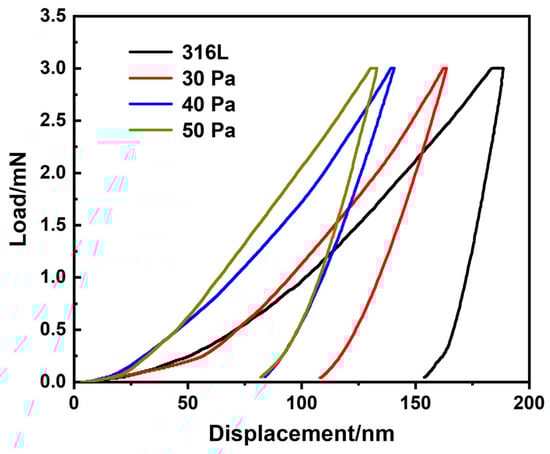 Variation curves of load versus displacement on the surface of alloying layers on 316L substrate and at 30 Pa, 40 Pa and 50 Pa of pressure.