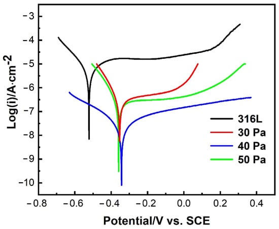 Figure 9 shows the potentiodynamic polarization curves of the 316L substrate and the Nb-Zr alloying layers prepared under pressures of 30 Pa, 40 Pa, and 50 Pa. The test samples exhibited very similar polarization behaviors as the potential increased. They were passivated and showed the passive regions before the protective films were broken. These data are similar to the experimental results for Nb-Zr alloying layers obtained by Zhou et al. The average values Eccor and Icorr from the polarization curves calculated by CorrView software (CorrView 3.10, Solartron Analytical, Oak Ridge, TN, USA) are presented in Table 4. For the substrate and Nb-Zr alloying layers prepared at different gas pressures, the Iccor values of all test samples were 5.05 × 10−6 (A·cm2), 1.35 × 10−7 (A·cm2), 1.26 × 10−8 (A·cm2), and 1.16 × 10−8 (A·cm2). It can be seen that the corrosion resistance of the Nb-Zr alloying layer was improved regardless of the pressure. This indicates that the Nb-Zr alloying layer on the surface of the 316L substrate inhibited the intrusion of the Cl− ions of the corrosive solution and increased the corrosion resistance. For the Nb-Zr alloying layers prepared at different working pressures, the corrosion potential Ecorr and corrosion rate first increased and then decreased with the working pressure, while the natural corrosion current Icorr first decreased and then increased. The corrosion current and rate of the alloying layer at 40 Pa were the lowest, and the corrosion resistance was better. The polarization potentials of the substrate and the Nb-Zr alloying layers are shown in Table 4. Compared with the substrate, the polarization potential of the Nb-Zr alloying layers increased to −0.35 V, −0.34 V, and −0.36 V at 30, 40, and 50 Pa of pressure, respectively. It can be seen from the material corrosion evaluation method that the higher the self-corrosion potential of the material, the smaller the self-corrosion current, and the better the corrosion resistance. The passivation zone is observed on the polarization curve, which indicates that a stable passivation film is formed on the surface of the Nb-Zr alloying layers [25,26]. Therefore, the prepared Nb-Zr alloying layer is expected to improve the corrosion resistance of these biomedical alloys in body fluids.