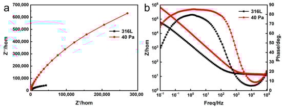 Figure 10 shows the EIS results after immersion in a 3.5% NaCl solution to reach a steady state in the form of a Nyquist diagram and Bode diagram. Figure 10a shows a Nyquist plot with similar behavior, indicating a typical capacitive response. It can be observed in the Nyquist diagram that the capacitance loop diameter of the Nb-Zr alloying layer was much larger than that of the 316L substrate, indicating that the alloying layer had a higher electrochemical performance [27,28]. An electrochemical reaction occurs in the electrolyte to form an oxide film with high impedance, which increases the resistance when the charge is transferred. The greater the capacitive reactance arc amplitude, the greater the electrochemical reaction impedance, and the better the corrosion resistance [29]. The Bode plot of the 40-Pa alloying layer sample in Figure 10b shows that the curve consists of a flat part at high frequencies, which was caused by the resistance of the electrolyte, and varies linearly over a wide frequency range, indicating the capacitive behavioral response of the passivation film [30,31]. In addition, the maximum phase angle of the Nb-Zr alloying layer was about −85° in the frequency range from 0.1 to 100 Hz, which was significantly higher than that of the 316L substrate. It is worth noting that the phase angle plateau of the Nb-Zr alloying layer was wider, but the substrate was significantly reduced. In the low frequency region, a high impedance value of about 106 (Ω·cm2) was obtained for the Nb-Zr alloying layer, while significantly lower impedance values were observed for the 316L substrate. These results reveal the excellent protective properties of the passivation film on the surface of the Nb-Zr alloying layer [32].