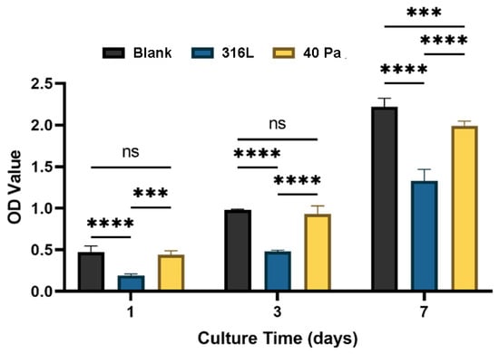 By studying the microstructure, surface state, and corrosion resistance of an Nb-Zr alloy layer, the optimum working pressure of an Nb-Zr alloy layer prepared by DGPSA technology was found to be 40 Pa. In order to test whether the Nb-Zr alloying layer prepared in this experiment had ideal biocompatibility, the biological activity of the Nb-Zr alloying layer was preliminarily evaluated by in vitro cell proliferation experiments. CCK-8 is a commonly used method for detecting the cell activity of implanted materials which can objectively and truly reflect the adhesion and proliferation of cells [33]. Statistical analysis of the cellular absorbance data was performed using GraphPad Prism (GraphPad Prism 9, GraphPad, CA, USA). Two-way ANOVA was selected to determine the significance of any statistical differences between groups, and significance was determined by a value of p < 0.05.