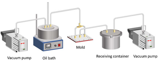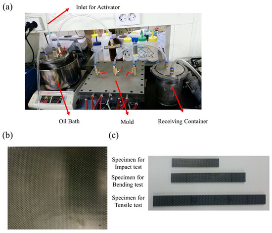 The carbon fiber-reinforced composite material was manufactured via the VARTM process. The experimental apparatus is schematically illustrated in Figure 2. The monomer (ε-caprolactam) was dried at 40 °C for 24 h in a vacuum oven. For the anionic polymerization of ε-caprolactam, the catalyst (sodium metal) was melted at 110 °C for 1 h in an oil bath under vacuum conditions. To maintain a fiber volume fraction of ca. 45%, thirteen layers of dried carbon fabric were used before injection into the well-sealed mold. The activator was then added to the monomer and catalyst mixture and then injected into the mold at a predetermined temperature (140, 160, 180, or 200 °C) for 5 min for polymerization. Subsequently, the carbon fiber-reinforced polyamide 6 composites (CFRPs) were released from the mold without cooling (Figure 3a,b).