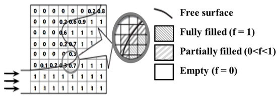To deal with the moving free surface for the current numerical simulation, a fixed grid method was used. Here, the mesh was treated as a fixed reference frame through which the fluid moves [23]. The volume of fluid (VOF) method was employed to treat the change in the calculation domain. By using the fractional fluid volume in a cell on fixed grids, the free surface is shown, with each rectangle in Figure 4 denoting a unit cell [21]. The fractional volume of the fluid, f, is defined for an element variable. The fractional volume in the total domain is divided into two regions, which are either occupied or empty according to the volume fraction of fluid [24]. Every cell is represented with the value of f in the numerical calculation. When the value of f lies between 0 and 1 (0 < f < 1), a cell is considered to be on the free surface [25]. Discontinuity in f is presented according to the following transport equation [26]: