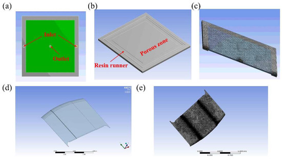 The time-dependent viscosity of caprolactam was implemented with user-defined function (UDF) subroutines in order to adopt experimentally determined viscosity models. The resin is injected into the mold at a constant pressure. Therefore, the pressure boundary condition was applied for the inlet boundary conditions. The permeability of woven carbon fabric used in this study is K1 = K2 = 8.0 × 10−11 m2, K3 = 4.0 × 10−12 m2. To evaluate the processing time for the overall mold filling process using the preform, a rectangular mold including upper (Figure 5a) and lower (Figure 5b) mold as well as the mesh (Figure 5c), and a mold for an automotive part (Figure 5d) as well as its mesh (Figure 5e) were considered.