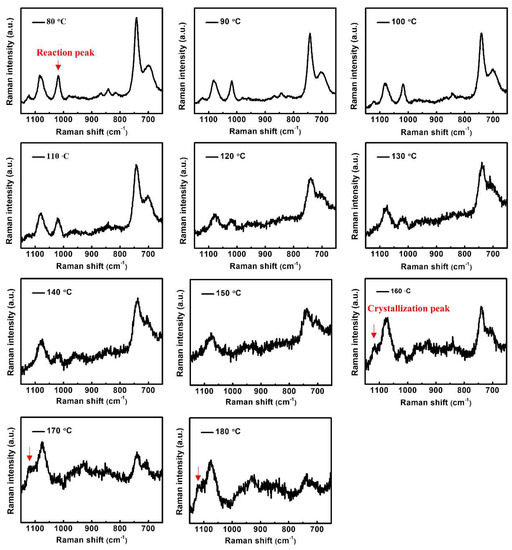 The mixture solution containing ε-caprolactam, the catalyst, and the activator was prepared and frozen under a liquid nitrogen condition to prevent the polymerization reaction. The frozen mixture samples were heated to 80 °C, and then from 80 °C to 180 °C at a heating rate of 5 °C/min; the corresponding Raman spectra are shown in Figure 6. Spectral differences were evident in the CC stretch region (1000–1150 cm−1) based on the temperature at which polymerization begins. The peak corresponding to the reactant (~1025 cm−1) persisted from 80 °C to 100 °C, but started to lose intensity at 110 °C, indicating that the polymerization of ε-caprolactam starts at this temperature.