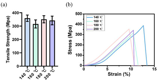 The tensile and bending properties of CFRTP composites were determined through a tensile and three-point bending test, respectively. First, the specimen for the tensile test was cut to dimensions of 100 × 13 × 3.75 mm3 according to ASTM D790-10. Figure 7 shows the results of the tensile test for the CFRP composites treated at different molding temperatures. As shown in Figure 7, the tensile strength and the strain of the CFRPs molded at 140 °C were slightly higher than for the samples molded at other temperatures.