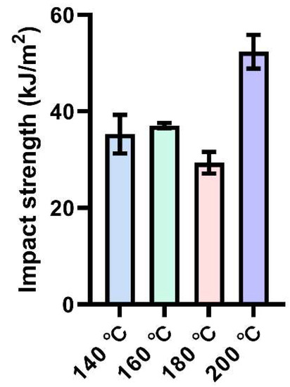 The Izod impact test was performed based on ASTM D256 in order to evaluate the impact resistance of the specimen in each case. The dimensions of each specimen were 61.5 mm (height) × 11.5 mm (depth) × 3.75 mm (width), with a notch depth of 2.54 mm. Figure 9 shows the impact strength of the CFRP composites that were molded at 200 °C, where the impact strength was much higher than that of the samples molded at other temperatures.