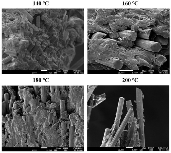 To observe the morphology of the interface between the fibers and resin, the fracture surfaces of the CFRTP specimens manufactured at different temperatures were examined via a SEM observation, as shown in Figure 10. The image of the fracture surface shows that the carbon fibers were uniformly impregnated into the carbon fabrics for the polyamide 6 resins molded at 140, 160, and 180 °C, whereas the fibers pulled out of the resins that were molded at 200 °C. This is due to unreacted monomer in the latter, and the results are consistent with the higher impact strength of the CFRPs molded at 200 °C compared with that of the samples molded at other temperatures.