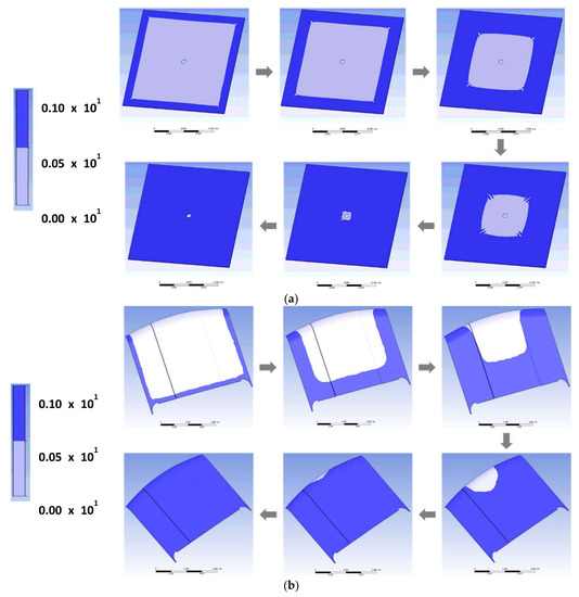 Phase contours (volume fraction of resin) of (a) rectangular mold with carbon fabrics; (b) automotive part with carbon fabrics.