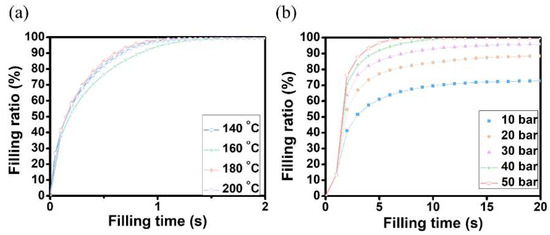 Relationship between mold filling time and filling ratio for (a) rectangular mold; (b) automotive hood.