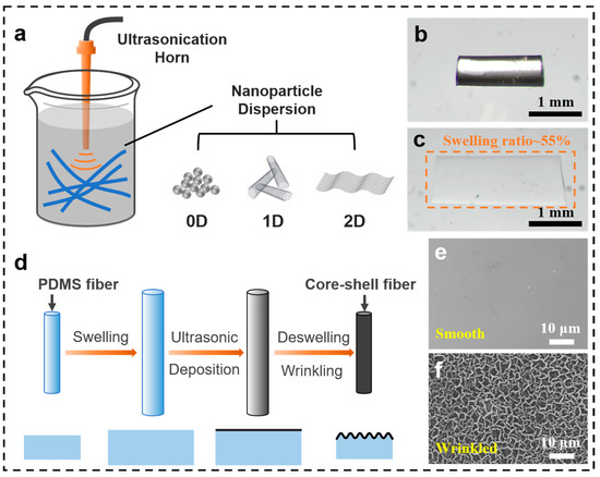 Figure 1 is a schematic illustration for the ultrasonic-assisted deposition method to decorate the wrinkled nanoparticle thin layer onto the surface of PDMS substrates. First, the PDMS substrates (e.g., fibers, sheets, or porous sponges) were soaked into a nanoparticle dispersion composed of either 0D, 1D, or 2D nanoparticles (e.g., SiO2, CNTs, RGO) and cyclohexane. Under the ultrasonic treatment, the PDMS substrates were immediately swelled by cyclohexane within 5 s. For instance, the length and diameter of the PDMS fiber expand at a ratio of ca. 55%, indicating an isotropic swelling, as shown in Figure 1b,c. With further ultrasonic treatment, the nanoparticles were uniformly deposited onto the surface of the swollen PDMS fiber. After a designed ultrasonic treatment time, the PDMS fiber was taken out of the dispersion. Subsequently, a wrinkle structure was spontaneously formed on the surface of the PDMS fiber upon the solvent evaporation. The surface wrinkling mechanism is demonstrated in Figure 1d. Obviously, this swelling–ultrasonic treatment is a one-pot procedure to create a wrinkled surface layer onto PDMS substrates. It is also a facile and efficient method without using prestretch–release equipment. For instance, after ultrasonic treatment in a CNT/cyclohexane dispersion for only 5 min, a labyrinth wrinkled CNT surface layer was formed on the PDMS fiber, in sharp contrast to the initial smooth PDMS fiber (Figure 1e,f).