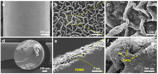 In our case, solvent swelling–deswelling is adopted to induce surface wrinkling between the surface nanoparticle layer and polymer substrate. PDMS elastomer with outstanding solvent resistance is chosen as the polymer substrate. Due to the chemically crosslinked polymer chains of thermosetting elastomer, PDMS substrate will be only swelled rather than dissolved in cyclohexane even with violent ultrasonic treatment. The voids among the PDMS molecular chains caused by solvent swelling enable the nanoparticles to anchor on the PDMS surface. Oppositely, thermoplastic polymer (e.g., TPU nanofiber mats) will be easily dissolved in its good organic solvent under ultrasonication. Figure 2 presents the surface and cross-section SEM images of CNTs@PDMS fibers. After being subjected to ultrasonic treatment for 5 min, the CNTs are thoroughly and uniformly decorated on the PDMS fiber surface, as shown in Figure 2a–c. During the decoration process, ultrasonication not only provides the driving force for CNTs to anchor on the PDMS surface, but also prevents CNTs from undesired agglomeration. Interestingly, a labyrinth wrinkle structure is formed on the surface of the PDMS fiber (Figure 1b,c), which is significantly distinct from the oriented wrinkle patterns induced by the uniaxial prestretch–release method [6,9,10]. This can be ascribed to the isotropic volume expansion of the PDMS fiber during solvent swelling (Figure 1b,c), which will generate isotropic compression stress between the deposited CNTs layer and PDMS substrate after solvent evaporation. Therefore, the labyrinth wrinkle pattern is induced, which is very similar to that induced by the biaxial prestretch–release method [7,18]. Obviously, both swelling and ultrasonication play crucial roles in the formation of the wrinkled surface layer on PDMS substrates, as demonstrated in Figure 1d.
