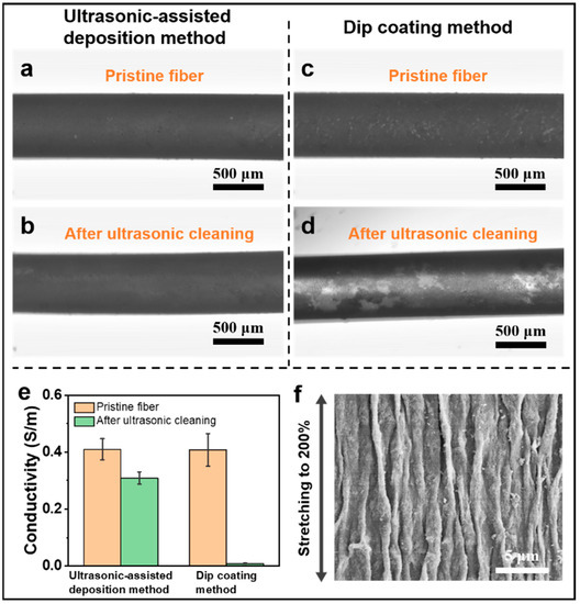 From the cross-section view of the CNTs@PDMS fiber (Figure 2e,f), it is extremely difficult to distinguish the interface between the CNT skin layer and the PDMS matrix because the very thin CNT film (nanometer scale) is firmly bonded on the PDMS fiber surface. The enlarged SEM image (Figure 2f) demonstrates that CNTs are partially embedded into the PDMS surface rather than just absorbed on the surface, which could provide strong interfacial interaction and prevent the CNT layer from cracking or delaminating upon large strain applied. To characterize the robustness of the wrinkled layer fabricated by the ultrasonic-assisted deposition method, the as-prepared CNTs@PDMS fibers are soaked in water for ultrasonic cleaning (Figure 3a,b). The conductivity of the CNTs@PDMS fiber slightly decreases from 0.41 S/m to 0.31 S/m (Figure 3e) and the fiber surface layer shows no obvious change after ultrasonic cleaning (Figure 3a,b). Furthermore, the wrinkled CNT surface layer can withstand 200% tensile strain without obvious cracking and delaminating (Figure 3f). On the contrary, the CNTs@PDMS fiber with similar initial conductivity fabricated by the dip-coating method demonstrates poor stability. Apparent delaminating is observed in Figure 3c,d and, thus, the conductivity of the fiber sharply decreases to 0.008 S/m (Figure 3e). Hence, the proposed ultrasonic-assisted deposition method provides a worthwhile strategy to deposit the robust wrinkled surface layer with strong interfacial bonding strength.