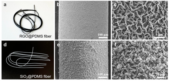 (a) Photograph of RGO@PDMS fibers. (b,c) Surface morphologies of RGO@PDMS fiber. (d) Photograph of SiO2@PDMS fibers. (e,f) Surface morphologies of SiO2@PDMS fiber.