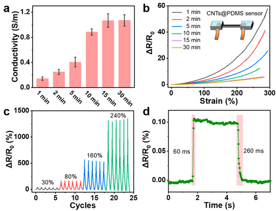 (a) Electrical conductivity against ultrasonic treatment time for the CNTs@PDMS fibers. (b) Relative resistance change against applied strain curves for CNTs@PDMS fiber strain sensors prepared from various ultrasonic treatment time. (c) Strain-sensing performance of CNTs@PDMS fiber strain sensor under various cyclic strains. (d) Response and recovery rates of CNTs@PDMS fiber strain sensor.