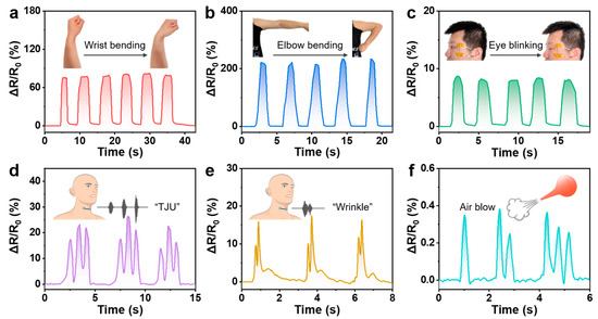 (a) Relative resistance change against wrist bending (a), elbow bending (b), eye blinking (c), speaking (d,e), and air blow (f).