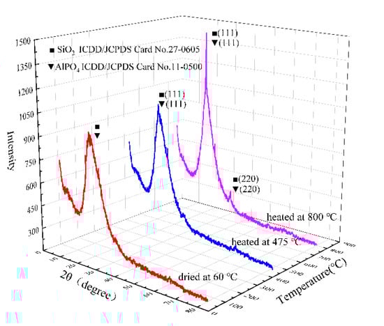 To reveal the structural changes of the coating during the heat process, the coating was dried at 60 °C and ground before high-temperature heat treatment. Then, the samples were taken at two stages of treatment and XRD tests were carried out. Figure 2 was the XRD patterns of samples with different heat-treatment temperatures. It can be found that in different heat-treatment stages, the peak shape changed significantly while the positions were the same. Specifically, there was broad and dispersive peak located at 15°–35° in the pattern representing the amorphous AlPO4 and SiO2 when dried at 60 °C. Since the peak positions of AlPO4 (ICDD/JCPDS 11-0500) and SiO2 (ICDD/JCPDS 27-0605) were close, it was difficult to directly separate the two phases. After the heat treatment at 475 °C, a sharp peak could be observed near 21°, which represents the AlPO4 (111) and the SiO2 (111). In addition, after heat treatment at 800 °C, the intensity of the peak around 21° was further enhanced in the XRD pattern, which indicates that the content of AlPO4 and SiO2 transforming into crystalline state increased. Furthermore, a sharp peak appeared at around 35° corresponding to AlPO4 (220) and SiO2 (220). Comparing the XRD patterns of the coatings at different heat-treatment stages, it can be concluded that with the increase in the heat-treatment temperature, the composition of the coating does not change significantly, and the content of crystalline AlPO4 and SiO2 increases. Since the failure of the coating in the heat process is usually related to the burnout at high temperature, combining the XRD and TGA results can further prove that the prepared coating has high-temperature resistance.
