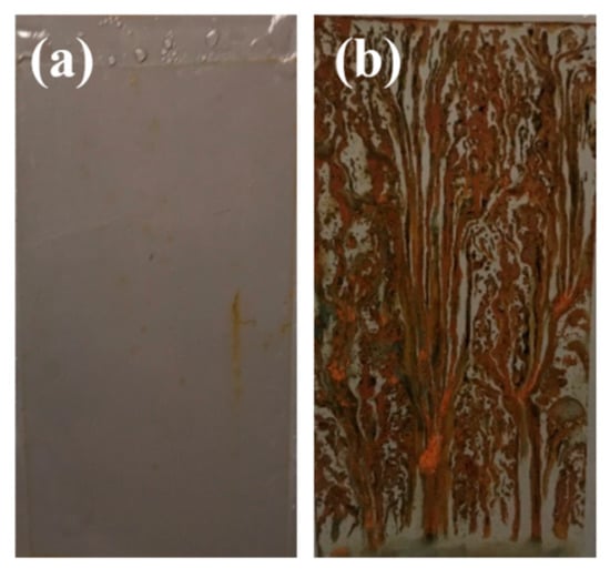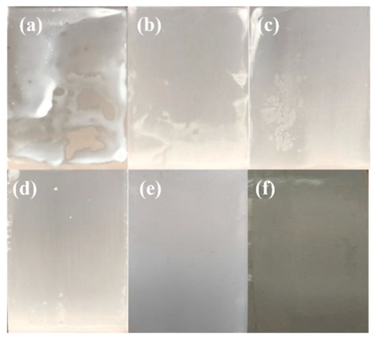 Many shrinkage holes and shrinkage edges appeared before the 1% Li-Ac coating is cured. After curing, the shrinkage area is increased, and the color of the surface is uneven (Figure 13a). The results indicate that the Li2SiO3 is unsuitable for the coating since it might change the tension. There are obvious shrinkage holes and shrinkage edges on the 0.5% K (Figure 13b) and 1% K (Figure 13c). The plate surface is not uniform. Although no particles are observed, there are white spots and their trailing traces on the surface of the 2% K sample (Figure 13d), indicating that there are gel particles in the coating. It also proves that the stability of 2% K is worse than that of 0.5% K and 1% K. 5% K-Mg has few precipitations, but there is no obvious defect on the plate prepared (Figure 13e), and the corrosion-resistance area of the NSS for 72 h is less than 5% (Figure 13f), so K2SiO3 is more suitable for chromium-free insulating coating.