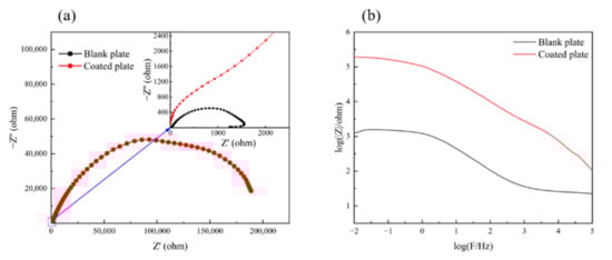 Figure 6 shows the EIS results of the chromium-free insulating coating for oriented silicon steel. Figure 6a is the Nyquist plot of the coated plate and the blank plate. As shown in the figure, the impedance radius of the coated plate is much larger than that of the blank plate, indicating that the coating effectively improves the corrosion resistance. Figure 6b shows the Bode plots of the coated plate and the blank plate. The impedance modulus value in the low-frequency area is effective in evaluating the corrosion resistance of the sample [29]. The low-frequency impedance modulus value of the coated board is two orders of magnitude higher than that of the blank board, which also indicates that the coating can effectively provide corrosion resistance.