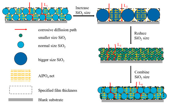 Figure 8 demonstrates the topographic characteristics of the coating consisting of SiO2 particles with different size. In the figure, the film thickness is fixed. This is because the thinner the insulating coating is, the better. The coating thickness on the surface of oriented silicon steel is usually 0.5–2.5 μm. Otherwise, the thick film would cause the decrease in metal proportion and influence the application of iron core, which consists of oriented silicon-steel sheets stacked up. In the figure, it is also observed that some SiO2 particles are above the AlPO4 net and some particles are under the net. This is based on the SEM and XRD analysis results, and we believe that Al(H2PO4)3 transforms into AlPO4 constituting a three-dimensional network structure, and the silica sol transforms into SiO2 particles interspersing in the net and stacking on the substrate. The length of the corrosive-diffusion path in the coating consisting of normal-size SiO2 particles is L1. When the thickness is fixed, increasing the size would reduce the amount of SiO2 or even the number of layers and the intergranular pore width would increase. The length of the corrosive diffusion path in such coating is L2. On the contrary, decreasing the size would increase the amount of SiO2, reduce the intergranular pore width and change the length of the corrosive-diffusion path to L3. When combining particles of different sizes, the small particles would fill the blanks among big particles and the path would be more complex and irregular. The length in such coatings is L4. It can be found that L3 is greater than L1 and L1 is greater than L2. L4 is depended on the difference between the two particle sizes, and the larger the difference, the more complex the path will be; that is, the increase in tortuosity. The increase in the length and tortuosity of the corrosion-penetration path can delay or even prevent the corrosion, and realize the increase in the corrosion resistance of the coating. Based on this inference, we selected silica sol with different particle sizes to prepare a chromium-free inorganic coating according to the formula shown in Table 2, and observed the morphology of the coating.