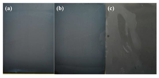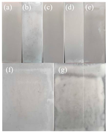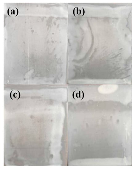 In the process of study about the particle size of silica sol, gelation occurred after a period when mixing alkaline silica sol and Al(H2PO4)3 solution. Considering that the Al(H2PO4)3 solution is acidic while the silica sol is alkaline, it may have been caused by the acid-base neutralization reaction changing the charge distribution and hydration radius of the colloidal particles, which affected the stability of silica sol [31]. To weaken the structural change of silica sol, we selected silica sol with different acidity and different particle size, prepared chromium-free inorganic coatings according to the formula shown in Table 3 and observed the coating morphology after curing (Figure 9). The coating with good morphology was tested by NSS, and the experimental results are shown in Figure 10.