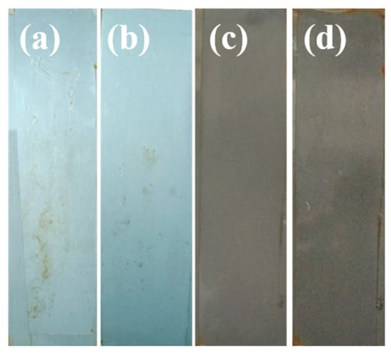 Figure 5 shows the NSS results of coated boards and blank boards. The results show that although the corrosion-resistance time has been reduced, the adjusted chromium-free coating still has good corrosion resistance. The corrosion area after 48 h of neutral salt-spray teat is less than 5%, while the corrosion area of the blank board after 2 h exceeds 90%. This is lower than the current industry requirement that the corrosion area is less than 5% in 5 h [28].