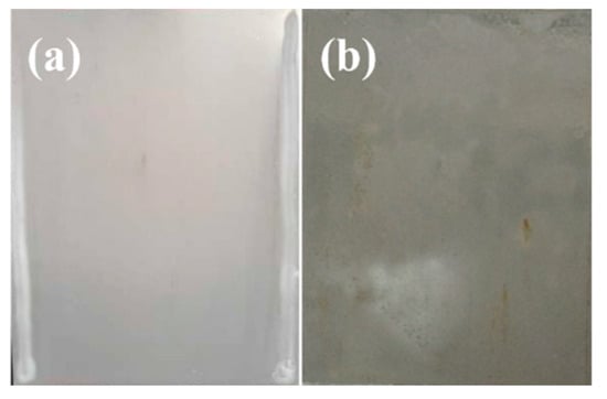 As the result, MgO was insoluble and became hard particles in Method A. In Method B, the mixture would be uniform after being stirred for 10 min. After silica sol was added, it became turbid. There was no improvement after continually stirring for 30 min. The paint was half-transparent after filtered, with a loss of 12 g. In Method C, there was no particle generating when adding Al(H2PO4)3 into the mixture of MgO and deionized water. However, it became milky white after adding silica sol. In Method D, when adding MgO and stirring for a few minutes, the mixture became jelly-like. After adding Al(H2PO4)3, the mixture returned to flow with some insoluble matter that may be MgO. If the stirring time was only 2–3 min after adding MgO and Al(H2PO4)3 was immediately added, there was no intermediate state but MgO would remain even after being stirred for 30 min. In Method E, the mixture quickly became gel after adding MgO. In Method F, the mixture became opaque when adding MgO and became transparent as the MgO was dissolved, but it became milky white with the addition of silica sol and the viscosity became larger. Furthermore, the viscosity increased after continuous stirring for 30 min. Method G had the same phenomenon as Method F at the first step, but there was no visible change in viscosity and transparency when adding silica sol. In Method H, the paint was always stable and this operation was simple, which was conducive to processing and production. Therefore, the appropriate way to add MgO is to dissolve in part of Al(H2PO4)3, mix with the remaining Al(H2PO4)3, and then use it in chromium-free insulation coatings. There are no obvious defects in the morphology of sheets coated with the paint prepared by this method. The corrosion area was less than 5% after NSS for 72 h, as shown in Figure 12b.