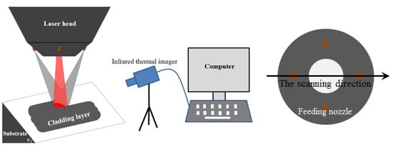 All laser cladding experiments in this work are carried out on a laser direct manufacturing system, which includes a YAG laser generator with a 4-kW maximum output power, a laser cladding head, a six-axis industrial robot, a negative pressure airborne powder feeding system and auxiliary equipment (water cooler, air compressor, et al.). The focusing lens of the cladding head has a focal length of 150 mm, and the spot size is 3 mm. The cladding material and the substrate used in the experiment are Ni60A self-fusing alloy powder and 45# steel, respectively. Their chemical compositions are listed in Table 1. The size of the spherical powder particle is 70–126 μm and the size of the substrate is 40 × 30 × 8 mm3. Before laser cladding, the powder is dried in a drying chamber at 120 °C for 2 h to remove moisture in the powder. The oxide layer of the substrate is ground mechanically and dried after rinsing with acetone. The substrate is placed on special supports with different tilt angles (0°–60°) for experiments. The special supports are made of 316L stainless steel. One side of the support is horizontal and the other side is designed at a specific tilt angle to place the substrate for laser cladding. The schematic diagram of the laser cladding process on a tilted substrate is shown in Figure 1. The processing parameters are adopted as follows: laser power—1400 W; scanning speed—3 mm/s; powder feed rate—0.133 g/s; overlap rate—40%. The multi-tracks’ cladding test has 10 tracks, and the length of a single track is 30 mm. Pure argon with 99.99% purity is used as the carrier gas and shielding gas, with a flow rate of 600 L/h. An infrared thermal imager with 100 Hz sampling frequency is aimed at a fixed point in the laser scanning track to detect the thermal cycle of the molten pool. The infrared thermal imager is fixed with a tripod and adopts a paraxial measurement method to measure the molten pool temperature. The schematic diagram is shown in Figure 1. The infrared thermal imager is recalibrated every time after adjusting the base substrate tilt angle.