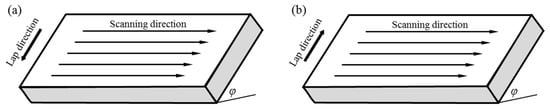 Unlike the multi-track one-way laser cladding on the horizontal substrate, there are two lap directions on the tilted substrate, i.e., downward lap (the latter cladding track below the previous one) and upward lap (the latter cladding track above the previous one), as shown in Figure 3. The different lap direction has a certain influence on the coating.