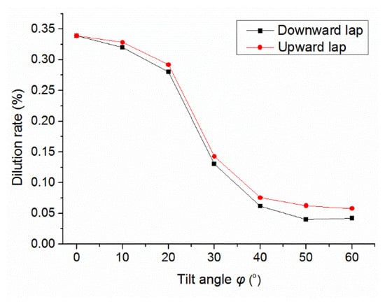 As shown in Figure 4, the cracking rate of Ni60A coating increases with the increasing substrate tilt angle. As the tilt angle increases from 0° to 60°, the cracking rate of the coating prepared by upward lap cladding increases 3.5 times, and that of the coating prepared by downward lap cladding increases 4 times. There are two main reasons for this result. Firstly, the average laser energy intensity decreases with the increasing substrate tilt angle, which reduces the gained laser energy of the unit area coating and increases the cooling rate of the molten pool. A large cooling rate not only decreases the rise time of slag and bubble in the molten pool but also reduces the influence of high temperature plastic flow on stress relaxation [,], which can increase defects and residual stress of the coating, making the coating more prone to cracking. Secondly, the energy attenuation rate increases with the increasing substrate tilt angle, which reduces the dilution rate (as shown in Figure 5) due to less energy being obtained by the substrate. A low dilution rate can hardly affect the hard precipitates of chromium borides and chromium carbides [], which reduces the plasticity of the coating and increases the susceptibility to cracking. Therefore, the cracking rate increases with the increase in the substrate tilt angle, with the same process parameters.