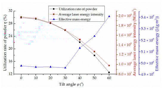 It can be seen that the energy attenuation rate increases with the increasing powder feed rate Vf and substrate tilt angle φ. Therefore, the increased tilt angle will partly reduce the utilization rate of laser power.