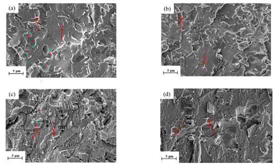 Some SEM fracture morphology images of different angles and different lap directions are shown in Figure 7. Figure 7a shows the fracture morphology when the substrate tilt angle is 0°. For the downward lap cladding, Figure 7b,d shows the fracture morphologies when the substrate tilt angle is 20° and 50°, respectively. For the upward lap cladding, Figure 7c shows the fracture morphology when the substrate tilt angle is 30°. It can be seen that there are some obvious characteristics of non-cleavage (as at the red arrows) at all fractures. This is mainly because hard Cr-rich precipitates and eutectic and amorphous phases are the main hard phases in Ni60A coatings, and the crack in the hard precipitate continues to propagate to break the eutectic and amorphous phases under the residual tensile stress, until a complete crack is formed []. Therefore, the substrate tilt angle has no influence on the cracking mechanism of Ni60A coating, and the fracture mode is quasi-dissociation.