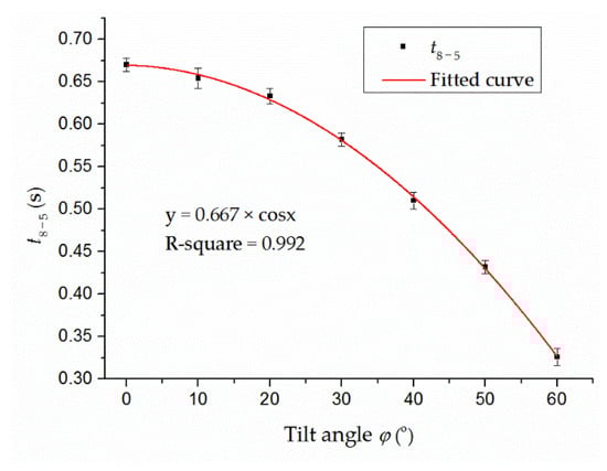 where t8−5,φ is the t8−5 value when the substrate tilt angle is φ and t8−5,0 is the t8−5 value when the substrate is horizontal. In this work, t8−5,0 = 0.667 s. When the substrate tilt angle increases to 60°, the value of t8−5 decreases 55%.