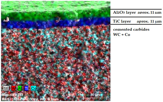 EDX analysis of the CNMG 120408-MP3 WPP10S indexable cutting insert confirmed the presence of an 8 µm thick TiC layer and an 11 µm thick Al2O3 layer (Figure 4).
