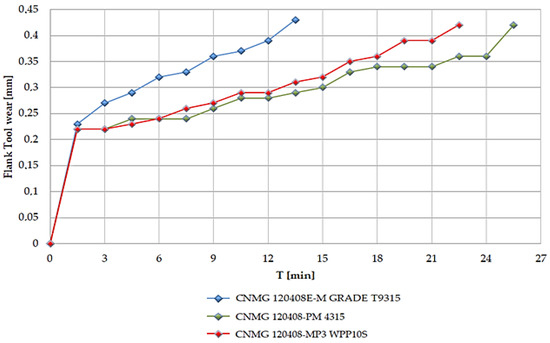 Figure 6 is a graphical representation of the wear profile for all three cutting inserts. It is obvious that the best result, i.e., the longer machining times, was achieved by the CNMG 120408-PM 4315 cutting insert, with the time of reaching the maximum specified wear rate T = 25.5 min. It is followed by a CNMG 120408-MP3.