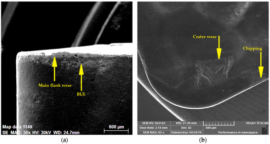 Inserts that had already reached the specified wear rate were subsequently examined using a Tescan Vega 3 electron microscope. SEM analysis confirmed several types of cutting edge wear, the most dominant of which was flank wear. At the same time, there is wear in the form of crater on the face and chipping of the blade or built-up edge (BUE).