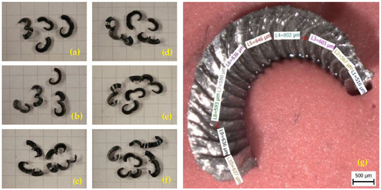 Another part of the experiment was the analysis of produced chips. The collection of samples took place in parallel with the measurement of flank wear VBmax, see Section 3.2. For evaluation, an Olympus SZX10 stereomicroscope equipped with a Bresser MicroCam-II digital camera with measurement software was used. The result is chronological documentation of the chip type (see Figure 13a–f) and analysis of its shape and size according to ISO 3685 (see Figure 13g). Chip length measurement was performed by the micrometric method using Bresser MicroCamLab II measurement software. The measured chips were selected numbers of four to five pieces so as to best represent the sample of a specific sample.
