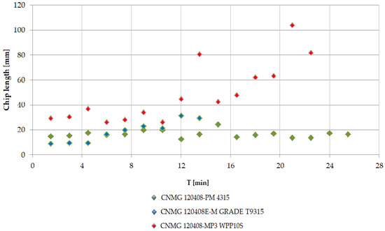 Figure 14 shows the size evolution of the produced chips as a function of the machining time for the individual manufacturers of the monitored inserts. From the data shown, it is clear that the size of the chip produced by the CNMG 120408-PM 4315 cutting insert culminated around a length of 16 mm, but there was no obvious progression in terms of tool wear depending on machining time. A certain increase in chip length was observed in the CNMG 120408E-M GRADE T9315 cutting insert in terms of tool wear. The chip length evolution of the CNMG 120408-MP3 WPP10S cutting insert was increasing from approximately half the tool engagement time, but with a relatively large dimensional peak.