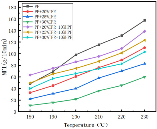 MFI of each group of flame-retardant-modified PP varies with temperature.