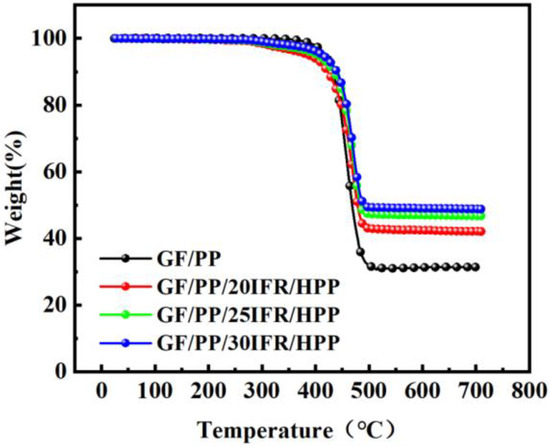To investigate the effects of flame retardants on CGF/PP, the thermal properties and the amount of residual char obtained from the CGF/PP and CGF/PP/IFR samples were compared by TGA testing in an N2 atmosphere. The CGF/PP and CGF/PP/IFR TGA curves are shown in Figure 3. The detailed data are listed in Table 2. The CGF/PP sample began to decompose at 419 °C, and the mass did not change beyond 490 °C, which was attributed to the remnant glass fiber. Compared to the CGF/PP sample, the CGF/PP/20IFR/HPP, CGF/PP/25IFR/HPP, and CGF/PP/30IFR/HPP samples did not decompose completely. The remaining residual carbon layer acted as an insulation barrier, increasing the thermal stability of the material system. The CGF/PP/IFR/HPP samples had similar TGA curves below 250 °C, but the mass of residual char increased with increased IFR loading above 400 °C, with the CGF/PP/20IFR/HPP, CGF/PP/25IFR/HPP, and CGF/PP/30IFR/HPP samples retaining up to 42.0, 46.7, and 48.7% char residue at 700 °C, respectively. The temperature corresponding to a 5% sample weight loss is defined here as the onset decomposition temperature, Tonset. As shown in Figure 3 and Table 2, the addition of IFRs slightly decreased the onset decomposition temperatures of CGF/PP. The onset temperatures, Tonset, for CGF/PP, CGF/PP/20IFR/HPP, CGF/PP/25IFR/HPP, and CGF/PP/30IFR/HPP were 419, 414, 404, and 387 °C, respectively. It can be seen that when the amount of IFR increased, Tonset decreased, which was attributed to the decomposition temperature of the IFR being lower than the PP decomposition temperature. Importantly, heat absorption during the decomposition of the IFR protected the PP matrix.