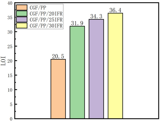 To explore the flame retardancy of the CGF/PP and CGF/PP/IFR/HPP samples, the LOI values and vertical burning ratings (UL-94) of the CGF/PP and CGF/PP/IFR/HPP samples with different IFR loadings were measured, and the results are presented in Figure 4 and Table 3. The GF/PP samples exhibited an LOI value of 20.5 and there was no rating from the UL-94 test (see Figure 3), while the LOI values of the CGF/PP/20IFR, CGF/PP/25IFR, and CGF/PP/30IFR samples were 31.9, 34.3 and 36.4, corresponding to increases of 55.6%, 67.3% and 77.5%, respectively.