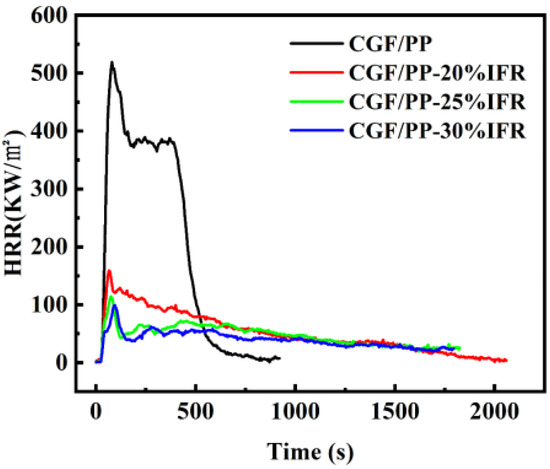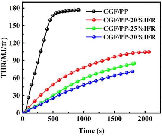 HRR is believed to be one of the most important parameters for quantifying fire hazards. Figure 5 shows the HRR curves for each sample, and the combustion parameters are listed in Table 4. As shown in Figure 5, the CGF/PP samples had a sharp PHRR, reaching 519.1 kW/m2. The TPHRR was 55 s, while the HRR curves of the CGF/PP/IFR/HPP samples were largely decreased; the PHRRs of the CGF/PP/20IFR/HPP, CGF/PP/25IFR/HPP, and CGF/PP/30IFR/HPP samples were 159.5, 117.4 and 101.1 kW/m2, corresponding to a decrease of 69.3%, 77.4% and 80.5%, respectively, and their respective TPHRRs were 46, 59 and 76 s. Thus, TPHRR increased with increasing IFR content. Notably, the TPHRR of CGF/PP/20IFR/HPP (46 s) was shorter than that of CGF/PP (55 s) because the addition of IFR decreased the PP decomposition temperature, which is consistent with the TGA results. The TTI of the CGF/PP, CGF/PP/20IFR/HPP, CGF/PP/25IFR/HPP, and CGF/PP/30IFR/HPP samples were 23, 20, 18 and 19 s, respectively. The same conclusion can be drawn, that lower IFR loading reduced the decomposition temperature of the samples, leading to shorter TTI. Beyond a certain IFR content, the TTI increased with increasing IFR content. It is shown in Figure 6 that the THRs of CGF/PP, CGF/PP/20IFR/HPP, CGF/PP/25IFR/HPP, and CGF/PP/30IFR/HPP samples were 176.7, 104.7, 85.4 and 71.5 MJ/m2, respectively. Thus, with increasing IFR content, THR decreased by 59.2, 48.3 and 40.5%, respectively, indicating that the addition of IFR effectively reduced THR.