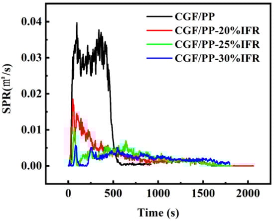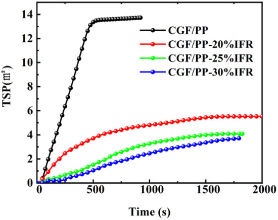While the effect of flame retardants on the heat release performance of the composites during combustion has been discussed, we note that there are two aspects to assessing fire hazard: thermal hazard (discussed above), and non-thermal hazards, such as whether the product is poisonous or corrosive, or its smoke production. Thus, here we discuss the non-thermal hazards associated with the CGF/PP-based samples with various IFR loadings. The SPR curves are shown in Figure 7 and TSP curves are shown in Figure 8. The pure CGF/PP samples had a higher SPR, reaching a peak of 0.041 m2/s, with the curve dropping sharply at approximately 500 s, which is consistent with the HRR curve from the CGF/PP sample. The curves of the CGF/PP/IFR samples decreased sharply. The PSPRs of the CGF/PP/20IFR/HPP, CGF/PP/25IFR/HPP, and CGF/PP/30/IFR/HPP samples were 0.018, 0.010 and 0.007 m2/s, respectively.