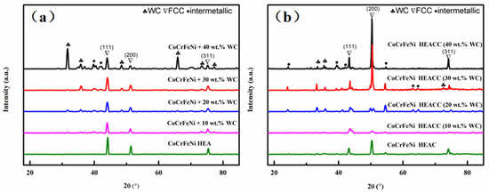 Figure 3. XRD patterns: (a) mixed powders; (b) CoCrFeNi HEACC.